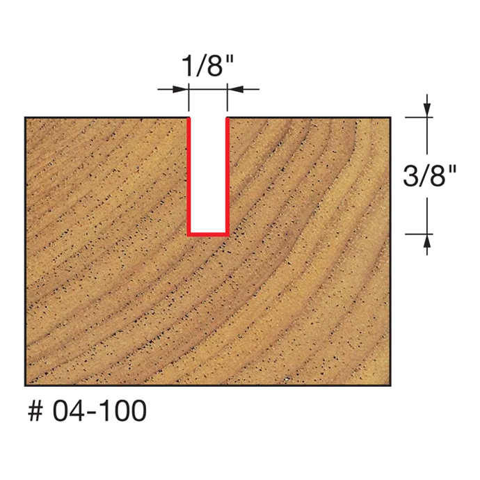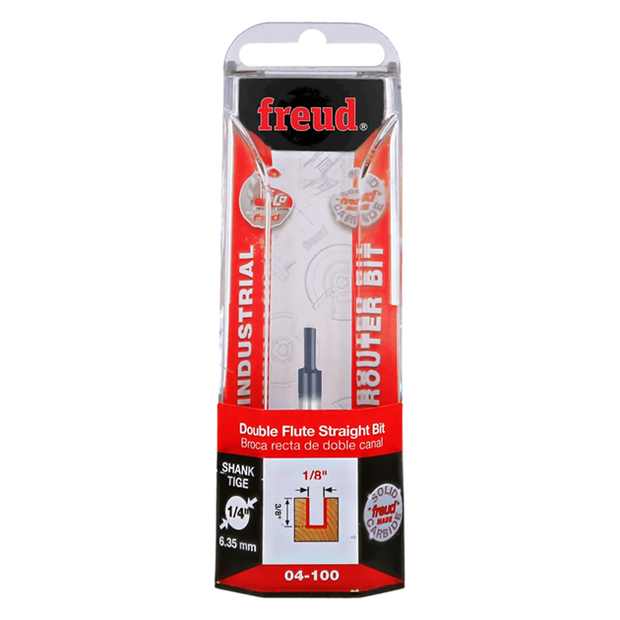 Manufacturer Freud Part Number 04-100-FRD Manufacturer's Part 04-100 Weight 0.200 lbs UPC/EAN Code 8925380016 Diameter 1/8" Shank Diameter 1/4" Overall Length 1-3/4" Type Double Flute Straight No. of Cutters 2 Max. RPM 24,000 RPM Carbide Height 3/8"