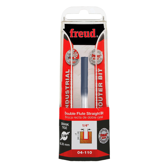 Manufacturer Freud Part Number 04-110-FRD Manufacturer's Part 04-110 Weight 0.200 lbs UPC/EAN Code 8925382379 Diameter 1/4" Shank Diameter 1/4" Overall Length 2-7/8" Type Double Flute Straight Material Black Ice No. of Cutters 2 Max. RPM 24,000 RPM Carbide Height 1"