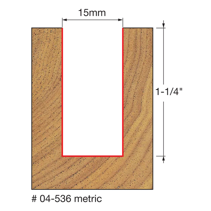 Manufacturer Freud Part Number 04-536-FRD Manufacturer's Part 04-536 Weight 0.200 lbs UPC/EAN Code 8925022633 Diameter 15 mm Shank Diameter 1/4" Overall Length 2-5/8" Type Double Flute Straight No. of Cutters 2 Max. RPM 24,000 RPM Carbide Height 1-1/4"