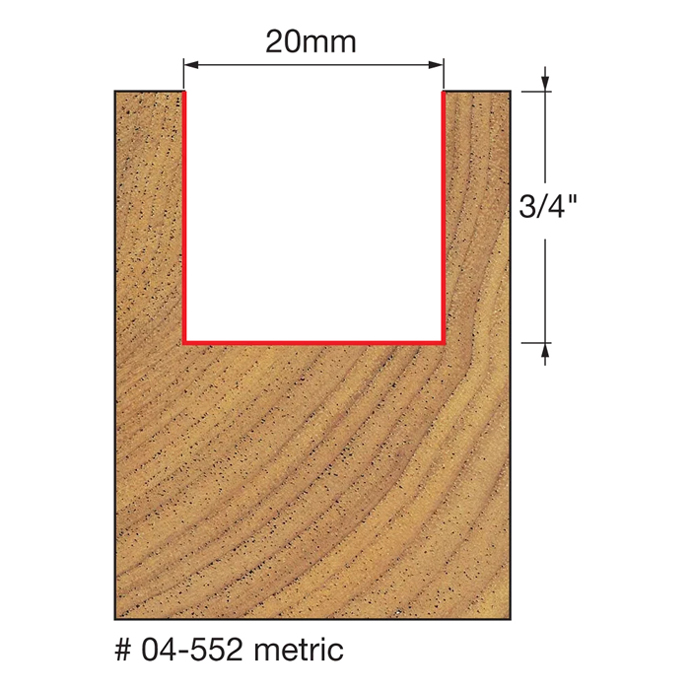 Manufacturer Freud Part Number 04-552-FRD Manufacturer's Part 04-552 Weight 0.200 lbs UPC/EAN Code 8925022688 Diameter 20 mm Shank Diameter 1/4" Overall Length 2" Type Double Flute Straight No. of Cutters 2 Max. RPM 24,000 RPM Carbide Height 3/4"