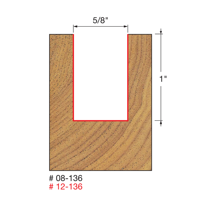 Manufacturer Freud Part Number 08-136-FRD Manufacturer's Part 08-136 Weight 0.120 lbs UPC/EAN Code 8925382577 Diameter 5/8" Shank Diameter 3/8" Overall Length 2-1/4" Type Double Flute Straight Material Tico Hi-Density Carbide No. of Cutters 2 Max. RPM 24,000 RPM Carbide Height 1"