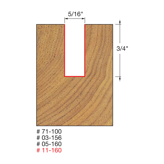 Manufacturer Freud Part Number 11-160-FRD Manufacturer's Part 11-160 Weight 0.180 lbs UPC/EAN Code 8925382638 Diameter 3/8" Shank Diameter 1/2" Overall Length 3" Type Single Flute No. of Cutters 2 Max. RPM 24,000 RPM Carbide Height 1-1/4"
