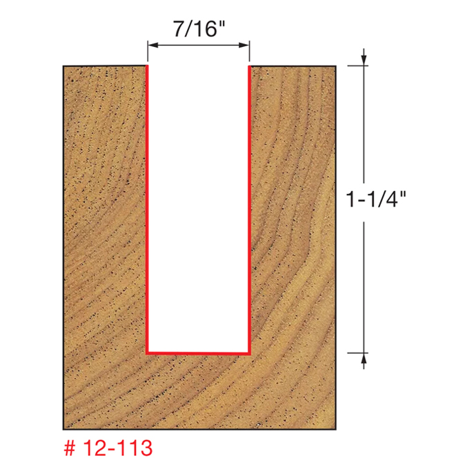 Manufacturer Freud Part Number 12-113-FRD Manufacturer's Part 12-113 Weight 0.170 lbs UPC/EAN Code 8925022725 Diameter 7/16" Shank Diameter 1/2" Overall Length 3-1/4" Type Double Flute Straight No. of Cutters 2 Max. RPM 24,000 RPM Carbide Height 1-1/4"