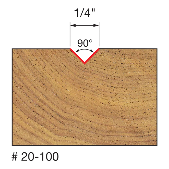 Manufacturer Freud Part Number 20-100-FRD Manufacturer's Part 20-100 Weight 0.070 lbs UPC/EAN Code 8925380450 Diameter 1/4" Shank Diameter 1/4" Overall Length 1-1/2" Type V Grooving No. of Cutters 2 Max. RPM 24,000 RPM Angle 90° Carbide Height 1/4" Angle Included 90° Angle Side 45°