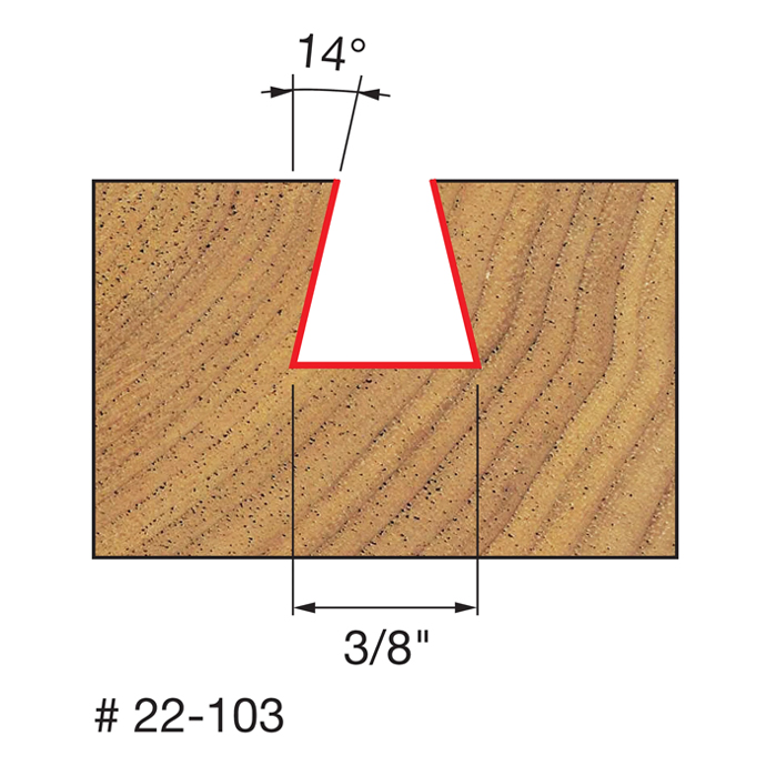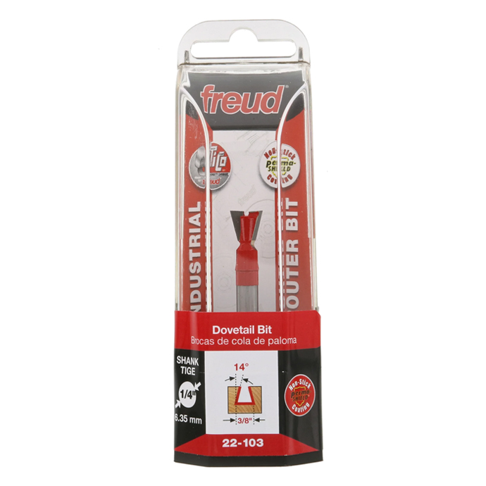 Manufacturer Freud Part Number 22-103-FRD Manufacturer's Part 22-103 Weight 0.070 lbs UPC/EAN Code 8925384779 Diameter 3/8" Shank Diameter 1/4" Overall Length 2-1/2" Type Dovetail No. of Cutters 2 Max. RPM 24,000 RPM Angle 14° Carbide Height 3/8"