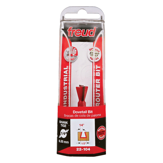 Manufacturer Freud Part Number 22-104-FRD Manufacturer's Part 22-104 Weight 0.060 lbs UPC/EAN Code 8925380511 Diameter 1/2" Shank Diameter 1/4" Overall Length 1-7/8" Type Dovetail No. of Cutters 2 Max. RPM 24,000 RPM Angle 14° Carbide Height 1/2"