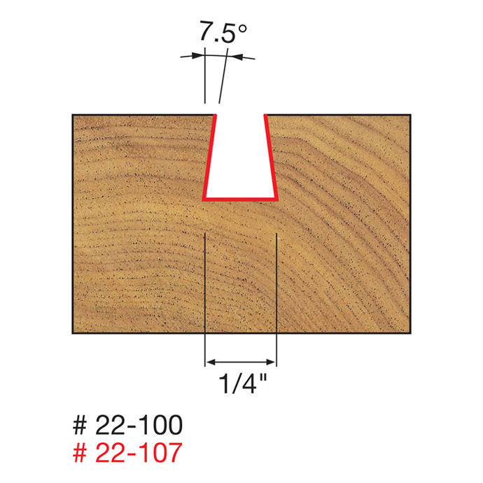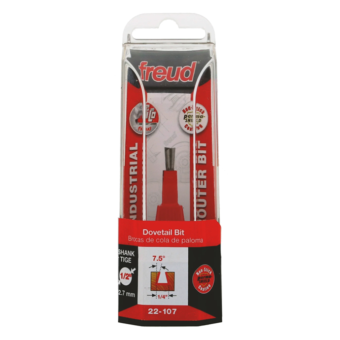 Manufacturer Freud Part Number 22-107-FRD Manufacturer's Part 22-107 Weight 0.130 lbs UPC/EAN Code 8925383017 Diameter 1/4" Shank Diameter 1/2" Overall Length 2-5/8" Type Dovetail No. of Cutters 2 Max. RPM 24,000 RPM Angle 7.5° Carbide Height 5/16"