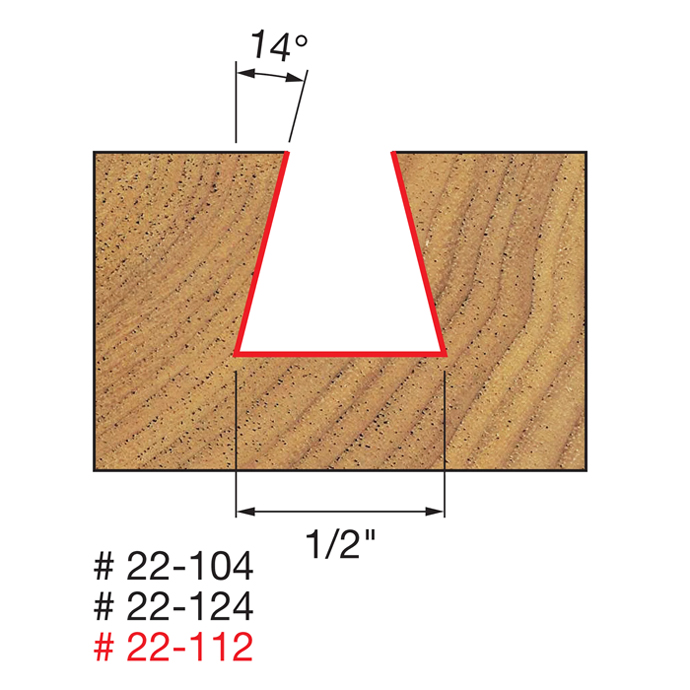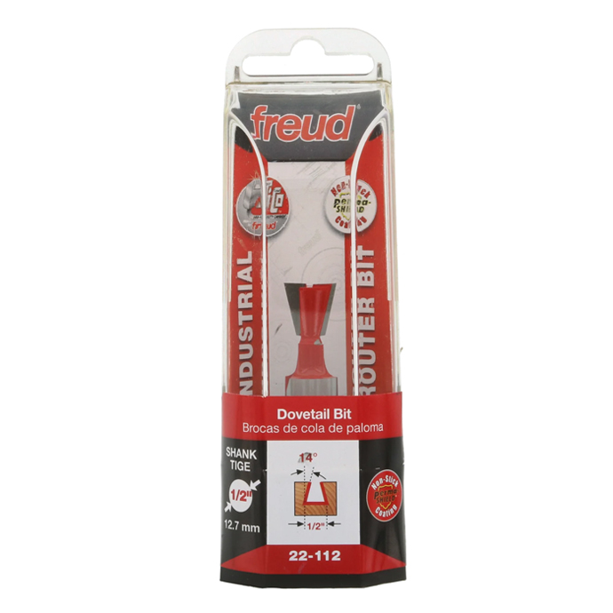 Manufacturer Freud Part Number 22-112-FRD Manufacturer's Part 22-112 Weight 0.130 lbs UPC/EAN Code 8925380535 Diameter 1/2" Shank Diameter 1/2" Overall Length 2-1/4" Type Dovetail No. of Cutters 2 Max. RPM 24,000 RPM Angle 14° Carbide Height 1/2"