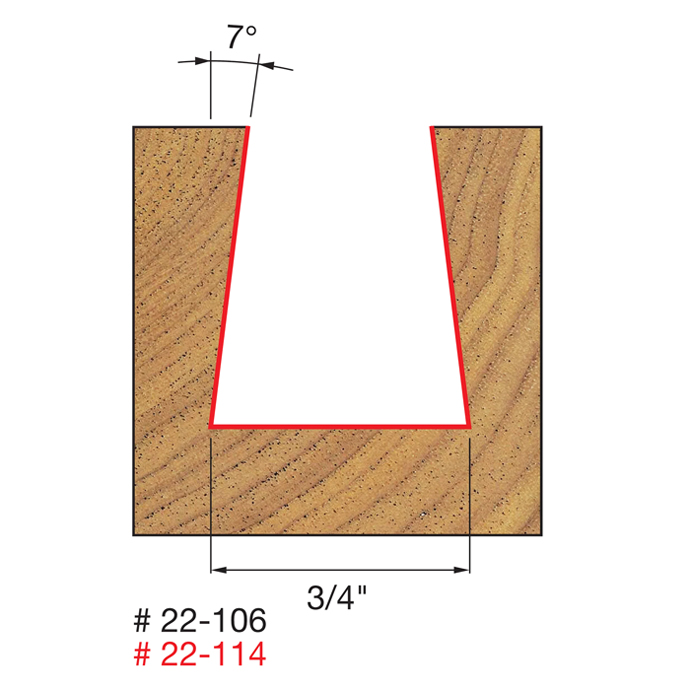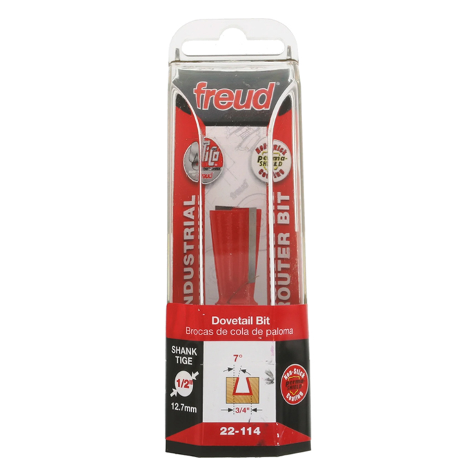 Manufacturer Freud Part Number 22-114-FRD Manufacturer's Part 22-114 Weight 0.170 lbs UPC/EAN Code 8925383031 Diameter 3/4" Shank Diameter 1/2" Overall Length 2-5/8" Type Dovetail No. of Cutters 2 Max. RPM 24,000 RPM Angle 7° Carbide Height 7/8"