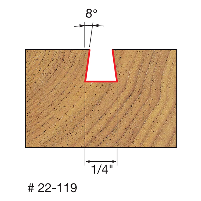 Manufacturer Freud Part Number 22-119-FRD Manufacturer's Part 22-119 Weight 0.080 lbs UPC/EAN Code 0 0892502175 9 Diameter 1/4" Shank Diameter 1/4" Overall Length 2" Type Dovetail No. of Cutters 2 Max. RPM 24,000 RPM Angle 8° Carbide Height 1/4"