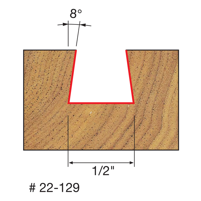 Manufacturer Freud Part Number 22-129-FRD Manufacturer's Part 22-129 Weight 0.070 lbs UPC/EAN Code 8925021728 Diameter 1/2" Shank Diameter 1/4" Overall Length 2-5/32" Type Dovetail No. of Cutters 2 Max. RPM 24,000 RPM Angle 8° Carbide Height 13/32"