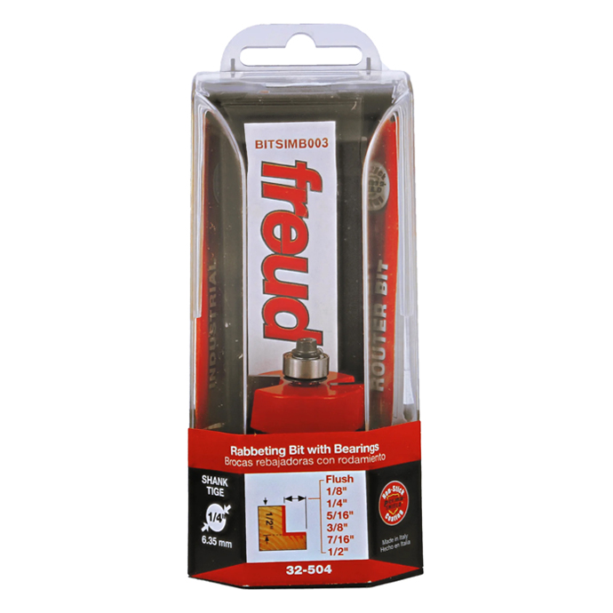 Freud Rabbeting Sets make versatile Rabbeting bits even more useful in the shop by offering a wide range of different depths of cut. With interchangeable bearings to cut rabbets of different depths, these sets provide a fast, easy way to adjust the size of the profile. Use them to make strong rabbeted joints, cut recesses to let in the back panels of cabinets, or create an interesting detail on built-up molding. Use in hand-held or table-mounted routers to cut hard or soft wood, plywood or composite material. 32-504, 32-524, and 32-526 can also be used as flush cutting trim bits. Wrench included
