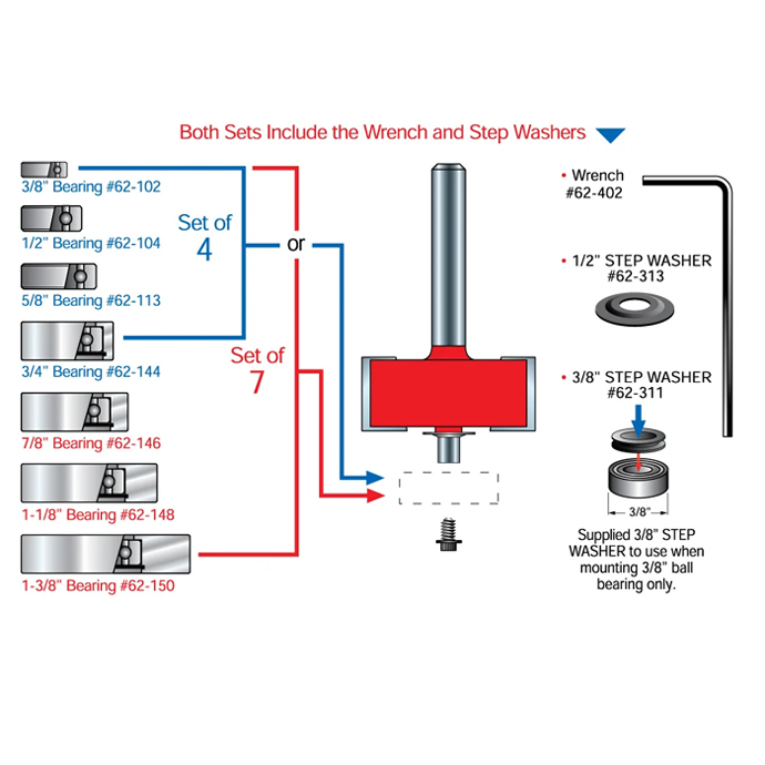 • Each set includes interchangeable bearings and a wrench to cut multiple depths with a single bit