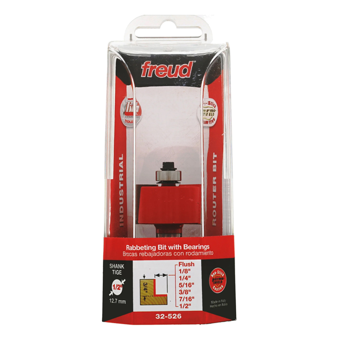 Freud Rabbeting Sets make versatile Rabbeting bits even more useful in the shop by offering a wide range of different depths of cut. With interchangeable bearings to cut rabbets of different depths, these sets provide a fast, easy way to adjust the size of the profile. Use them to make strong rabbeted joints, cut recesses to let in the back panels of cabinets, or create an interesting detail on built-up molding. Use in hand-held or table-mounted routers to cut hard or soft wood, plywood or composite material. 32-504, 32-524, and 32-526 can also be used as flush cutting trim bits. Wrench included
