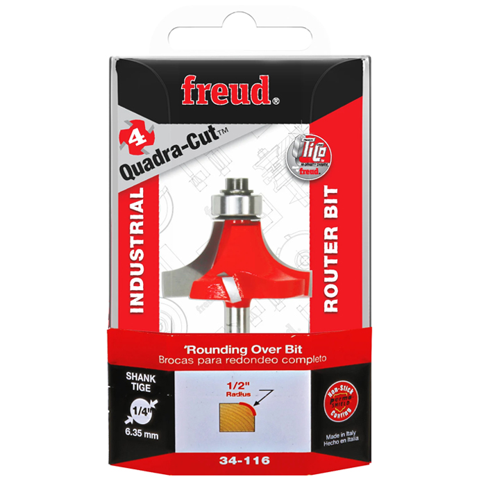 Manufacturer Freud Part Number 34-116-FRD Manufacturer's Part 34-116 Weight 0.190 lbs UPC/EAN Code 8925380726 Diameter 1-1/2" Shank Diameter 1/4" Overall Length 2-1/2" Type Rounding Over No. of Cutters 4 Bearing Diameter 1/2" Carbide Height 3/4" Radius 1/2"
