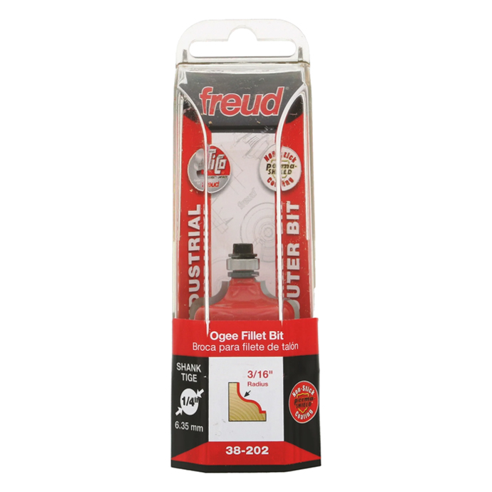 Manufacturer Freud Part Number 38-202-FRD Manufacturer's Part 38-202 Weight 0.130 lbs UPC/EAN Code 8925383444 Diameter 1-1/4" Overall Length 2-1/8" Type Ogee Fillet No. of Cutters 2 Max. RPM 18,000 RPM Bearing Diameter 3/8" Carbide Height 1/2" Large Radius 3/16"