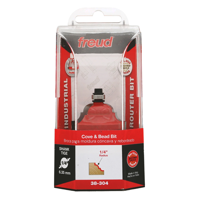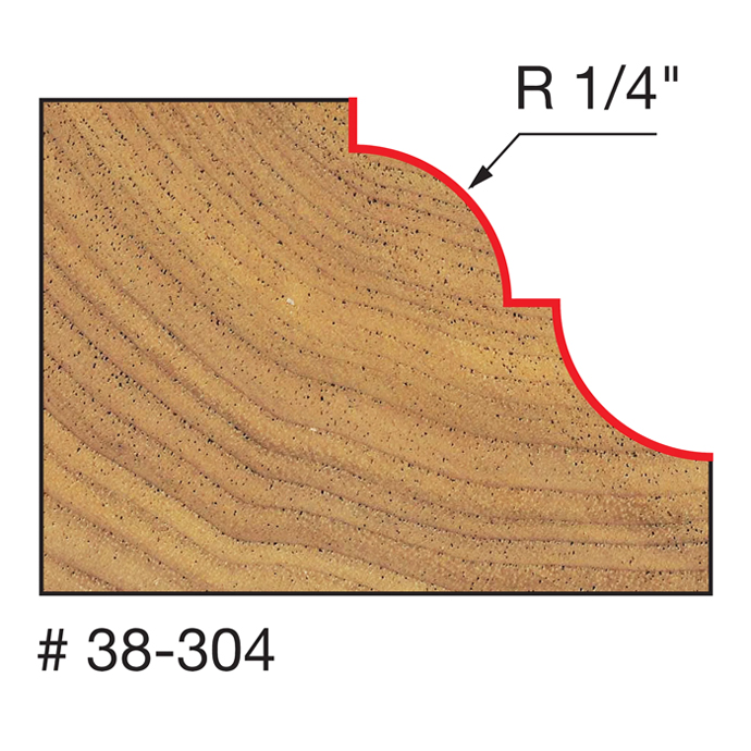 Manufacturer Freud Part Number 38-304-FRD Manufacturer's Part 38-304 Weight 0.200 lbs UPC/EAN Code 8925383482 Diameter 1-9/16" Shank Diameter 1/4" Overall Length 2-5/16" Type Cove & Bead No. of Cutters 2 Max. RPM 16,000 RPM Carbide Height 23/32" Minor Height 7/32" Large Radius 1/4"