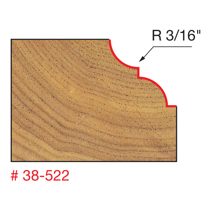 Manufacturer Freud Part Number 38-522-FRD Manufacturer's Part 38-522 Weight 0.120 lbs UPC/EAN Code 8925383574 Diameter 1-1/4" Shank Diameter 1/4" Overall Length 2-1/16" Type Classical Bold Cove & Round Bit No. of Cutters 2 Max. RPM 18,000 RPM Carbide Height 7/16" Large Radius 3/16"