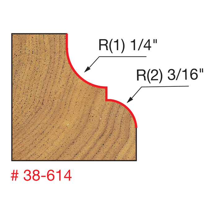Manufacturer Freud Part Number 38-614-FRD Manufacturer's Part 38-614 Weight 0.340 lbs UPC/EAN Code 8925384595 Diameter 1-3/8" Overall Length 2-3/4" Type Classical Cove & Round No. of Cutters 4 Max. RPM 16,000 RPM Bearing Diameter 1/2" Carbide Height 11/16" Minor Height 5/64" Small Radius 3/16" Large Radius 1/4"
