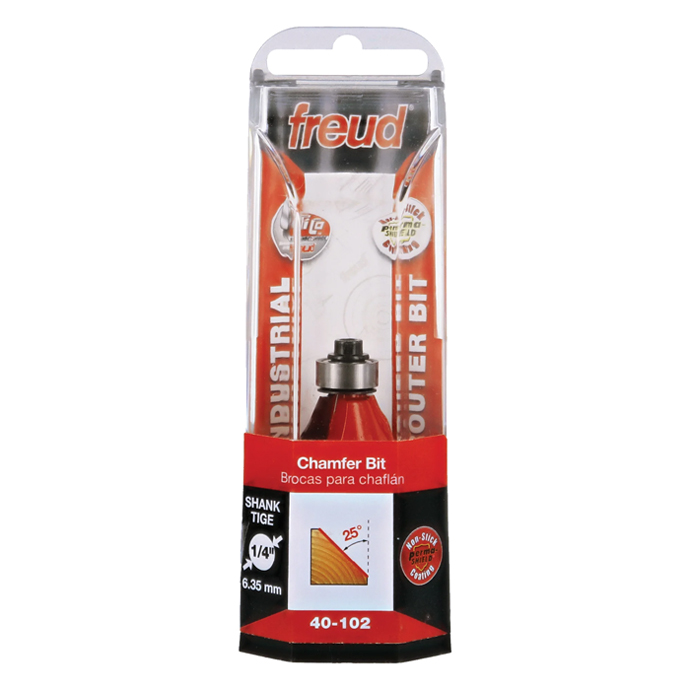 Manufacturer Freud Part Number 40-102-FRD Manufacturer's Part 40-102 Weight 0.110 lbs UPC/EAN Code 008925380931 Diameter 15/16" Overall Length 2-3/16" Type Chamfer No. of Cutters 2 Max. RPM 24,000 RPM Angle 25° Bearing Diameter 1/2" Carbide Height 1/2"