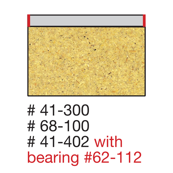 These bits are true multipurpose tools, allowing you to trim laminates with your choice of a flush or bevel edge without changing bits. Bit 41-402 is self-guided and comes with two bearings that spread wear evenly on the cutting edge and allow the bit to straight trim or create a 45° bevel. Item numbers 41-300 and 68-100 trim plastic laminates with straight or bevel edges on routers equipped with a guide system.