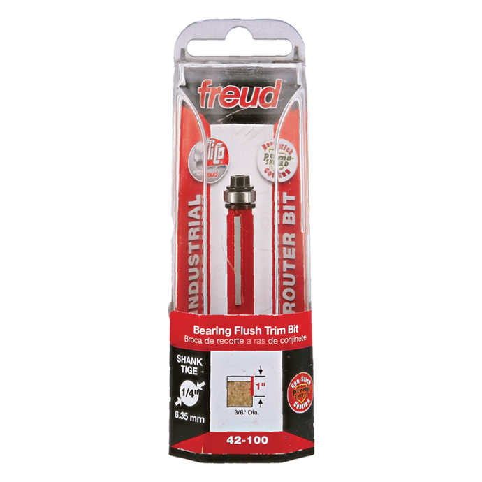 Manufacturer Freud Part Number 42-100-FRD Manufacturer's Part 42-100 Weight 0.080 lbs UPC/EAN Code 8925380979 Diameter 3/8" Shank Diameter 1/4" Overall Length 2-13/16" No. of Flutes 2 Type Bearing Flush Max. RPM 24,000 RPM Bearing Diameter 3/8" Carbide Height 1"