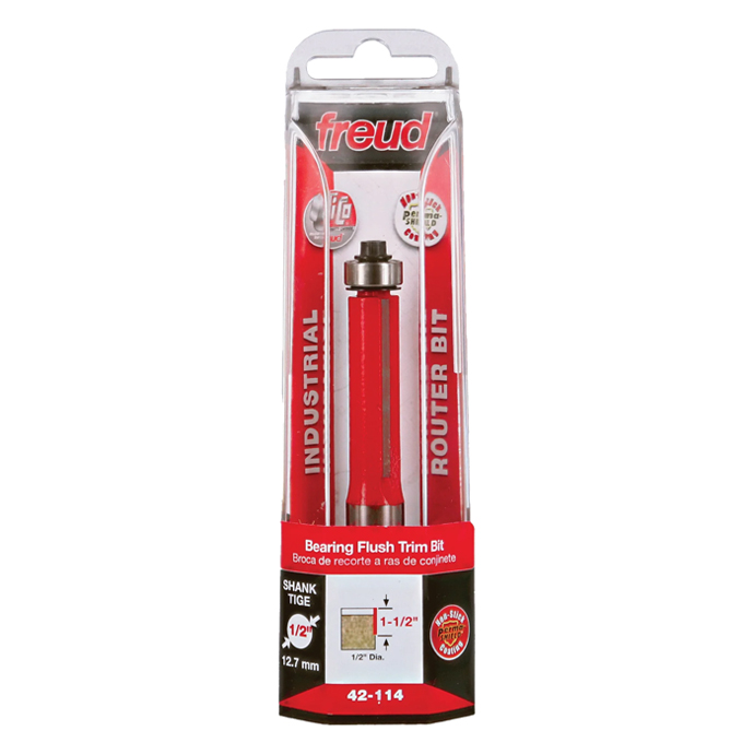 Manufacturer Freud Part Number 42-114-FRD Manufacturer's Part 42-114 Weight 0.190 lbs UPC/EAN Code 8925381020 Diameter 1/2" Shank Diameter 1/2" Overall Length 3-5/8" No. of Flutes 2 Type Bearing Flush Max. RPM 24,000 RPM Bearing Diameter 1/2" Carbide Height 1-1/2"