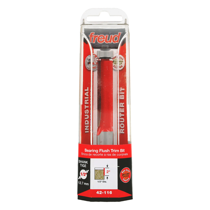 Manufacturer Freud Part Number 42-116-FRD Manufacturer's Part 42-116 Weight 0.240 lbs UPC/EAN Code 8925381037 Diameter 1/2" Shank Diameter 1/2" Overall Length 4-3/8" No. of Flutes 2 Type Bearing Flush Max. RPM 24,000 RPM Bearing Diameter 1/2" Carbide Height 2"