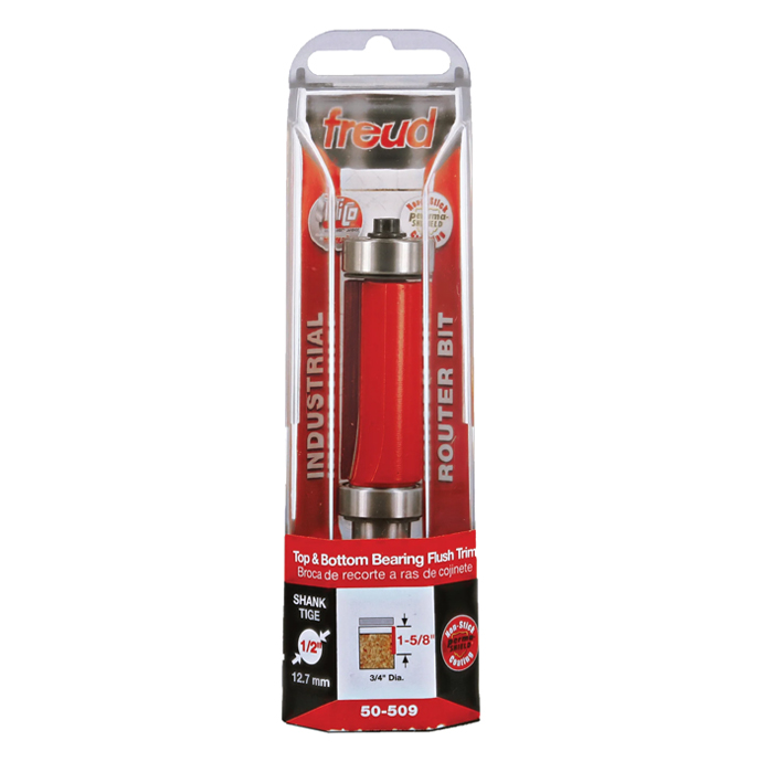 Manufacturer Freud Part Number 50-509-FRD Manufacturer's Part 50-509 Weight 0.330 lbs UPC/EAN Code 8925037910 Diameter 3/4" Shank Diameter 1/2" Overall Length 3-7/8" No. of Flutes 2 Type Top and Bottom Bearing Flush Max. RPM 24,000 RPM Bearing Diameter 3/4" Carbide Height 1-5/8"