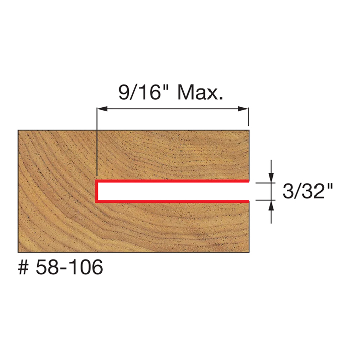 Manufacturer Freud Part Number 58-106-FRD Manufacturer's Part 58-106 Weight 0.100 lbs UPC/EAN Code 8925381167 Diameter 2" Type Four Wing Slotted Cutter Bore Diameter 5/16" No. of Cutters 4 Max. RPM 16,000 RPM Carbide Height 3/32" Cut Depth 9/16"