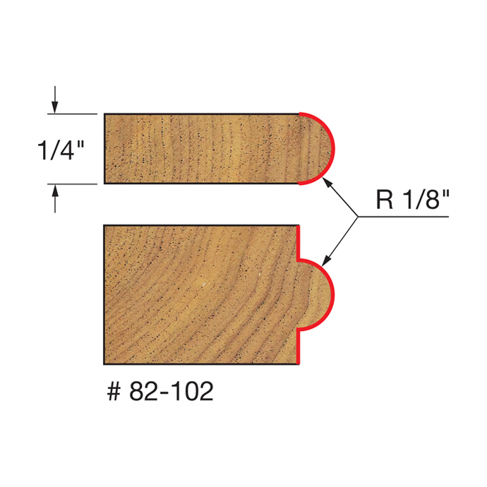 Manufacturer Freud Part Number 82-102-FRD Manufacturer's Part 82-102 Weight 0.090 lbs UPC/EAN Code 8925381341 Diameter 3/4" Shank Diameter 1/4" Overall Length 1-7/8" No. of Flutes 2 Type Half Round Max. RPM 24,000 RPM Carbide Height 1/2" Radius 1/8"