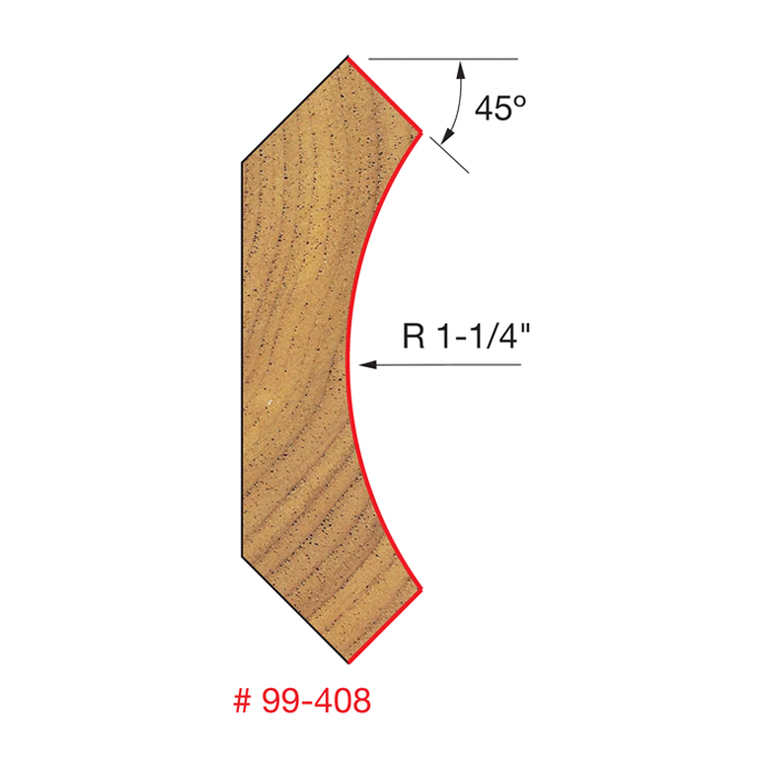 Manufacturer Freud Part Number 99-408-FRD Manufacturer's Part 99-408 Weight 0.540 lbs UPC/EAN Code 8925386124 Overall Length 3-3/4" Type Crown Molding No. of Cutters 2 Max. RPM 18,000 RPM Angle 45° Carbide Height 2-1/4" Large Radius 1-1/4"