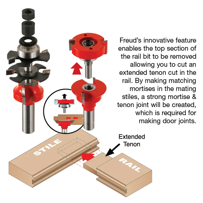 Freud's unique Premier Adjustable Rail and Stile System builds perfect doors in material from 5/8" to 1-1/4" thick, and also features Freud's patented technology for producing extra-strong long tenon joints. The System also includes adjustable shims to adjust the panel groove from 7/32"(5.5mm) for thinner plywood panels to 3/8" (9.5mm) thick for larger solid wood raised panels. Offered in five different profiles to suit any project! For even more versatility, add optional cutters to produce double-sided doors, or the optional cutter for glass and screen door construction. Use in table-mounted routers to mill and hardwood or softwood.