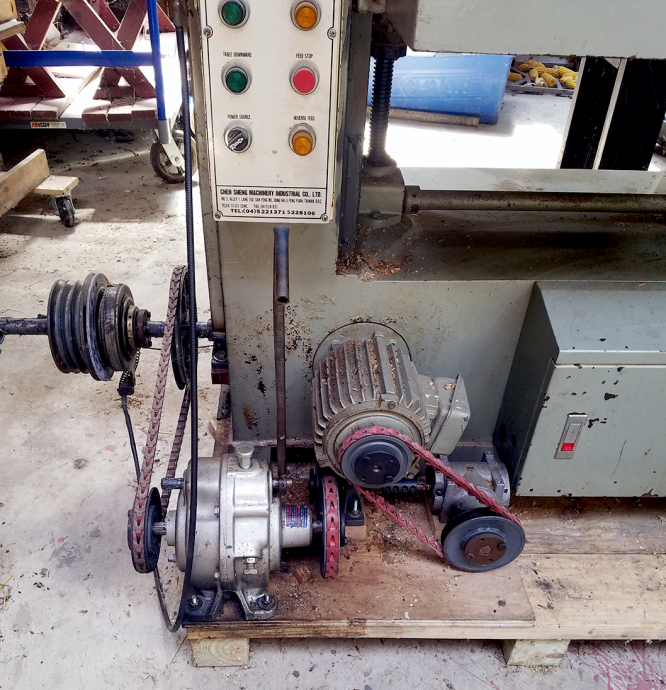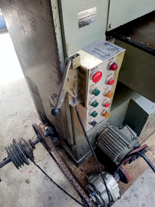 • table positioning system powered by lineshaft with gear box activated by hand lever.